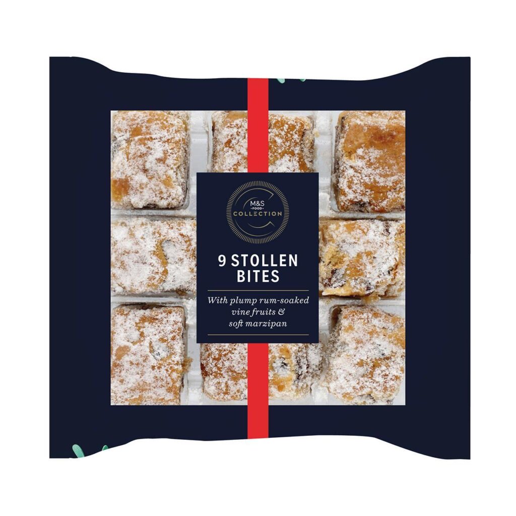 These slightly bigger than bitesized stollen slices have the traditional vine fruits, enriched dough and marzipan but are also finished with rum butter.